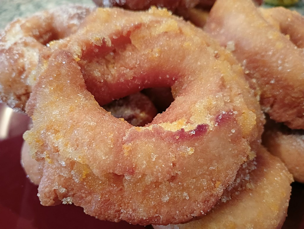 El fin de semana hemos preparado ya un dulce típico de Semana Santa para ir calentando motores. Como sé que a Rafa y a mi padre les encantan los roscos fritos, los he querido hacer diferentes y probar otros sabores, pero manteniendo la tradición. Les he dado un toque de naranja y almendras y han quedado buenísimos. La masa lleva ralladura y zumo de naranja y además luego los he rebozado con una glasa preparada con agua, azúcar y ralladura de naranja, lo que le aporta un toque dulce y sabroso buenísimo. No se puede describir el olor en la cocina de dulce tradicional, con aroma a naranja, roscos fritos… Además de lo divertido que es prepararlos en familia.