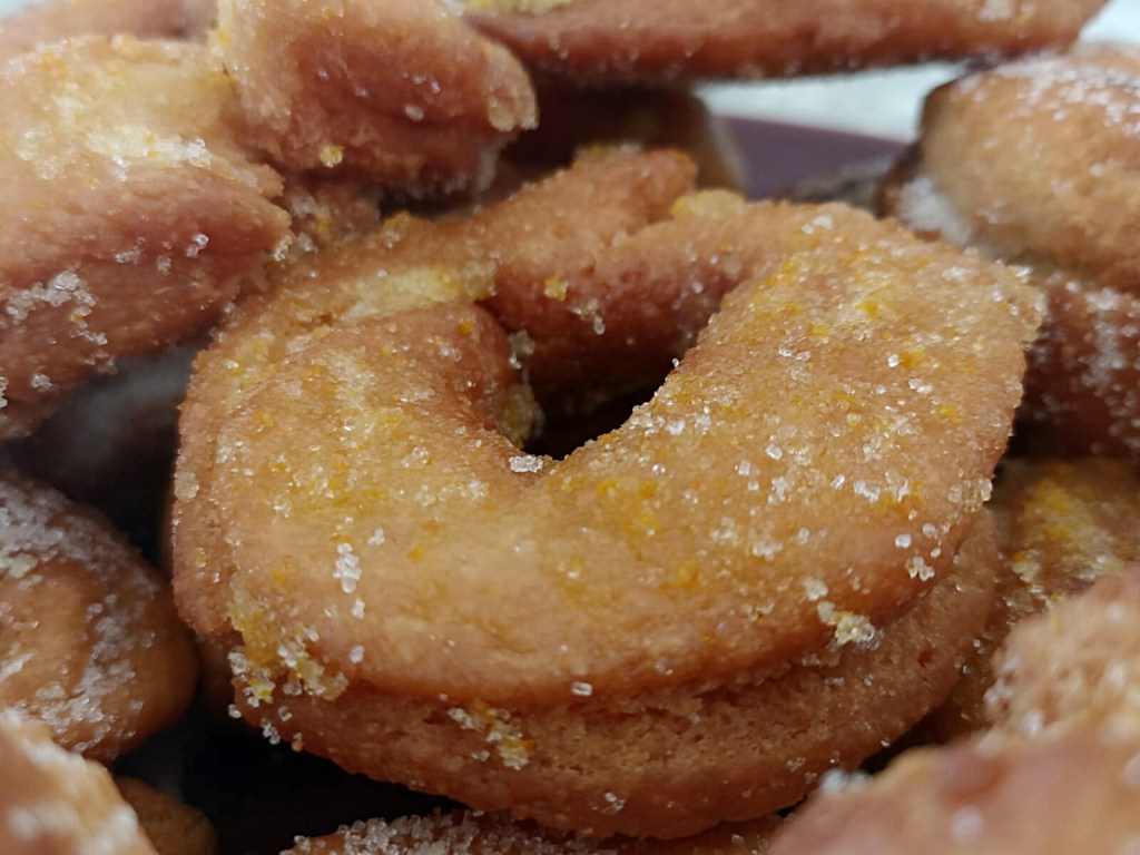 -preparamos un glaseado para ir pintando nuestras rosquillas. Para ello, mezclamos azúcar, ralladura de naranja y un poco de agua hasta que veamos que obtenemos una especie de jarabe con textura espesa para bañar o pintar las rosquillas