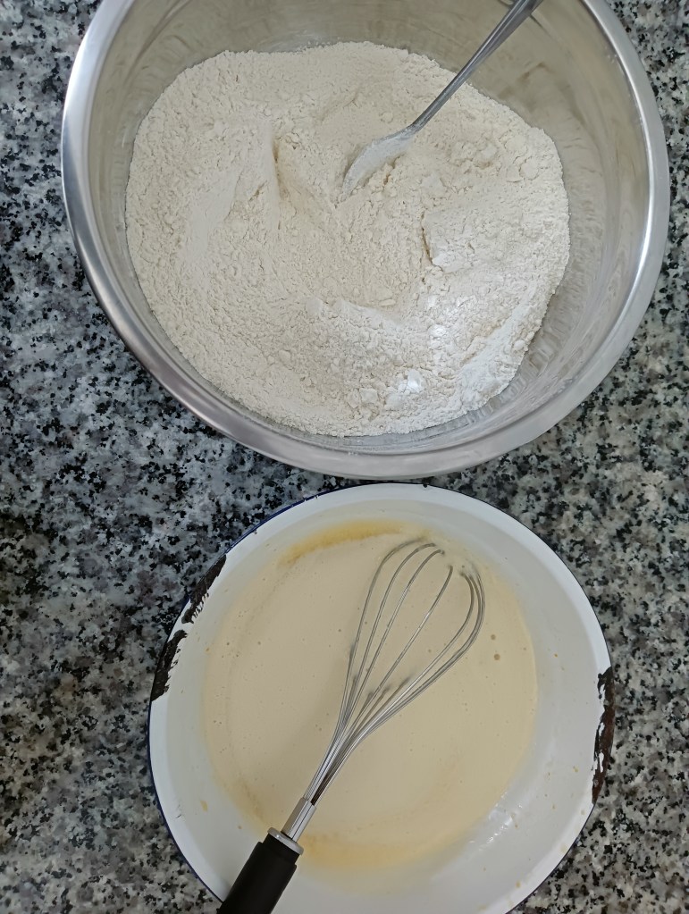 -mezclamos el aceite que ya tenemos templado con la mezcla de huevos que hemos batido antes. Añadimos el anís y el zumo de naranja y por último añadimos la harina