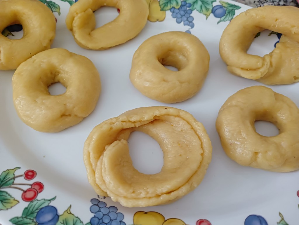 -una vez la masa haya reposado, hacemos bolitas, las chafamos y luego atravesamos con el dedo para darle forma, intentando que no sean muy gordas, ya que luego crecen cuando se fríen