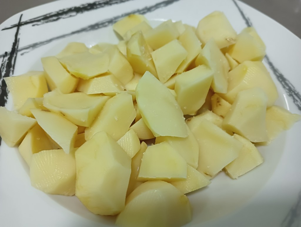 -empezamos pelando las patatas y las cortamos en daditos pequeños para que se cocinen rápido