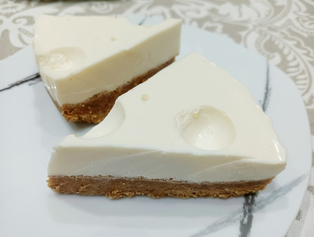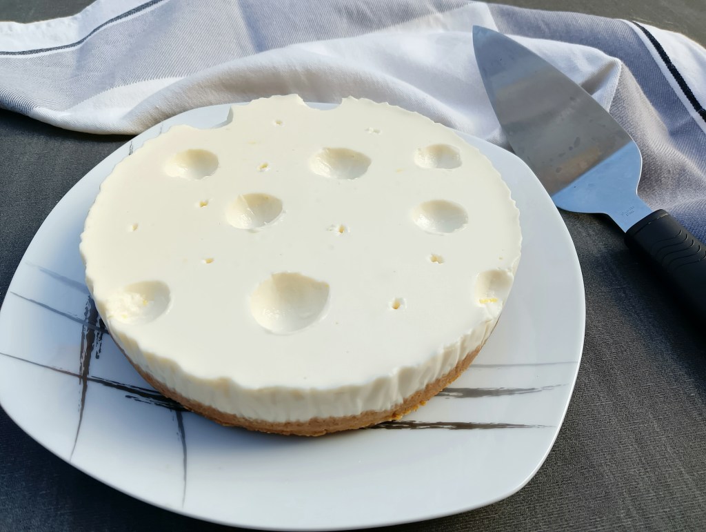 Aprovechando que tenía una tarrina de queso crema en la nevera he querido hacer una tarta de queso sin horno, fría. Lleva una base de galleta y mantequilla y luego la podéis decorar si queréis con mermelada. En este caso, yo he optado por darle forma de queso gruyère, haciéndole unos agujeros con un sacabolas. Nos ha gustado mucho de sabor y es sencilla de preparar, muy recomendable si queréis hacer un postre rápido, bueno y vistoso.