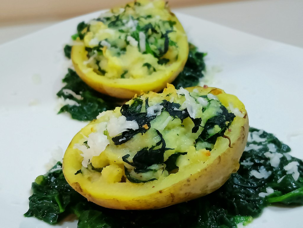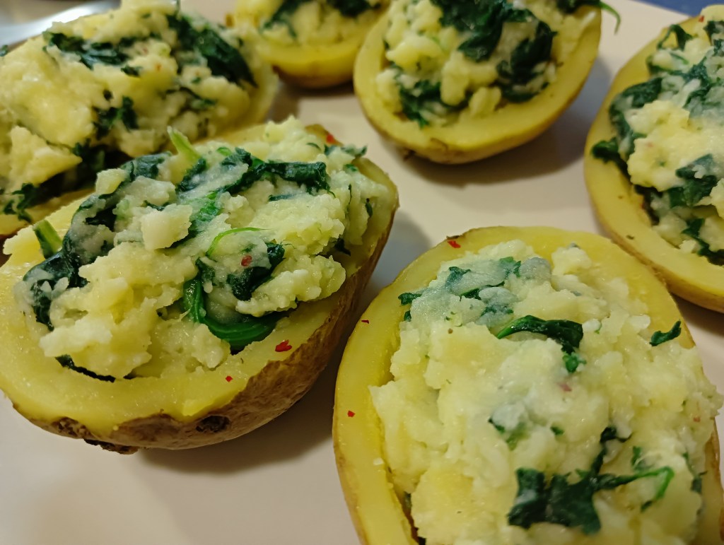 Los que me conocéis sabéis que me encantan las patatas y el queso, así que la combinación de estos dos ingredientes juntos es un éxito. He querido hacer unas patatas rellenas de queso y espinacas, para que tenga un poco de verdura, que le aporta un toque de sabor y color. Es un buen acompañamiento o una cena ligera. Las patatas están hervidas y luego las he partido a la mitad para vaciarlas y así preparar el relleno con la propia patata, mezclada con queso y espinacas, un plato muy sencillo y rico.