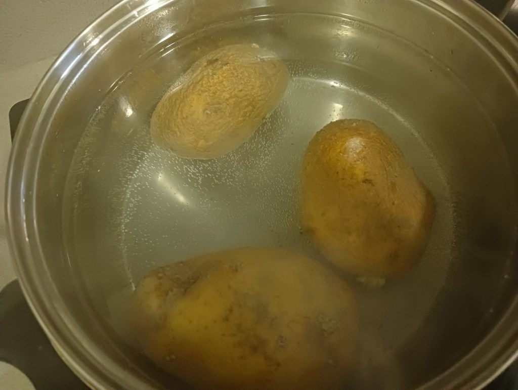 -limpiamos bien las patatas, ya que las coceremos con piel en una olla con agua y abundante sal. Lo hacemos a fuego medio para que no revienten. Las vamos pinchando con un palillo hasta que estén blandas