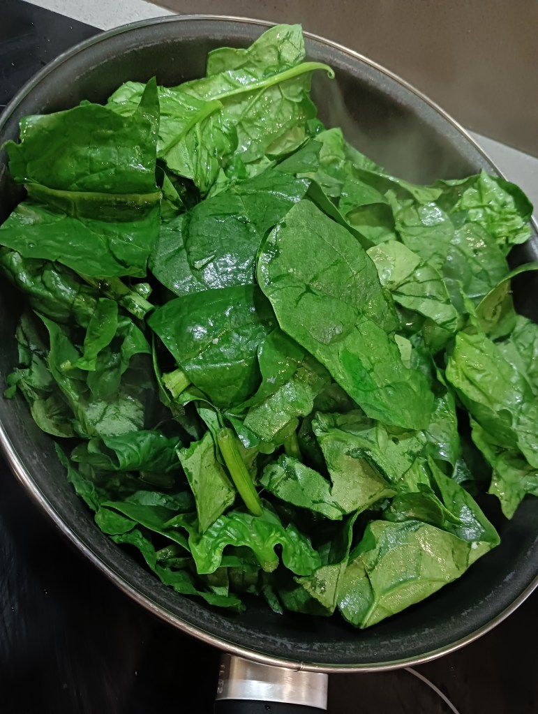 -por otro lado, cocinamos las espinacas en una sartén con un chorrito de aceite y las aliñamos con sal y pimienta