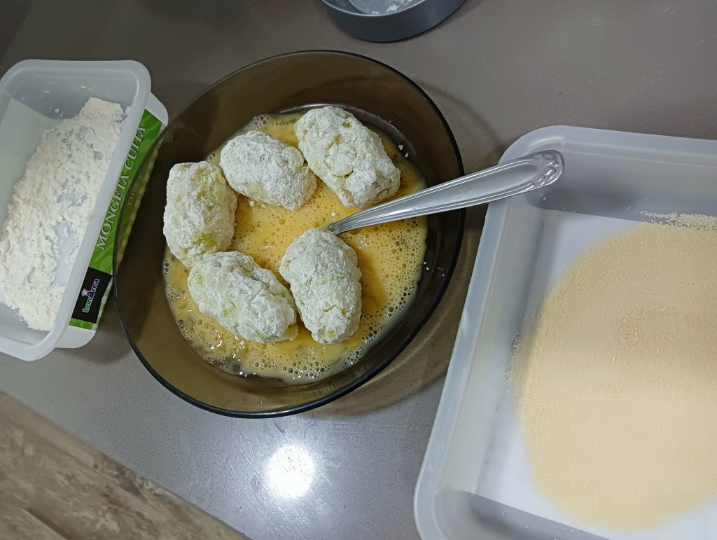 -hacemos porciones y las rebozamos. Yo las paso primero por harina, luego por huevo batido y luego por pan rallado. Para que no revienten en el horno, hago un doble rebozado y las vuelvo a pasar por huevo y pan rallado, así se sellan mejor