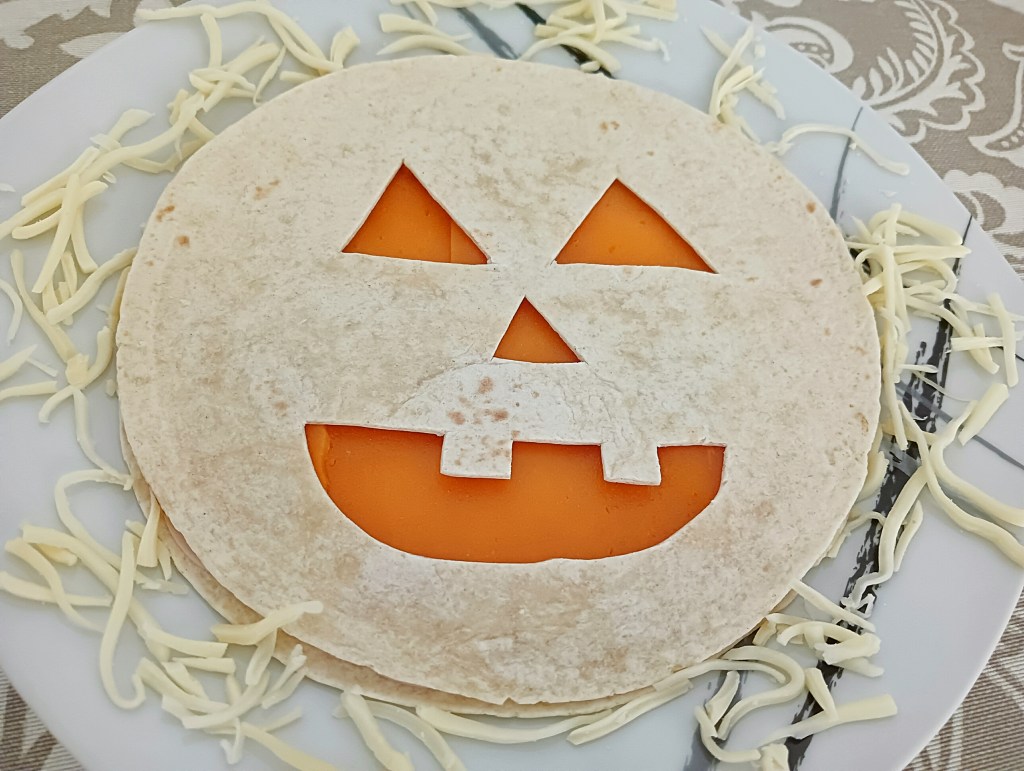 Para preparar este entrante, solo se necesitan dos tortitas de maíz, que calentamos en una sartén y a la parte superior le recortamos los ojos, nariz y boca. Para el relleno he utilizado queso cheddar y jamón dulce, pero podéis utilizar los ingredientes que prefiráis. Es un aperitivo tan sencillo como cocinar un poco en la sartén y servir.