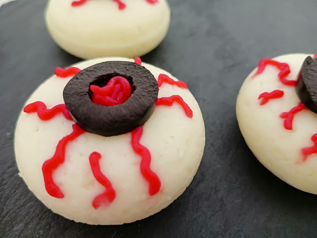 Estos ojos son bolitas de queso babybel, a las que les hemos pintado unas venas (lo podéis hacer con ketchup o colorante alimenticio). En el centro llevan una rodajita de oliva negra.