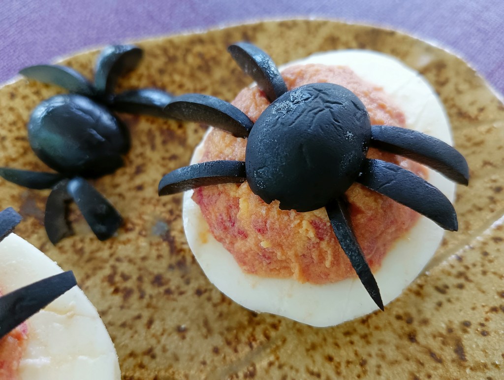 Este aperitivo son unos huevos cocidos, que una vez duros, los partimos a la mitad y vaciamos la yema. Yo las he mezclado con jamón dulce y tomate, pero se pueden mezclar con atún, pisto… Y luego solo hay que rellenar las mitades. Por encima, para simular una araña, cortamos unas olivas negras y las colocamos para adornar y darle un toque de sabor a nuestro aperitivo.