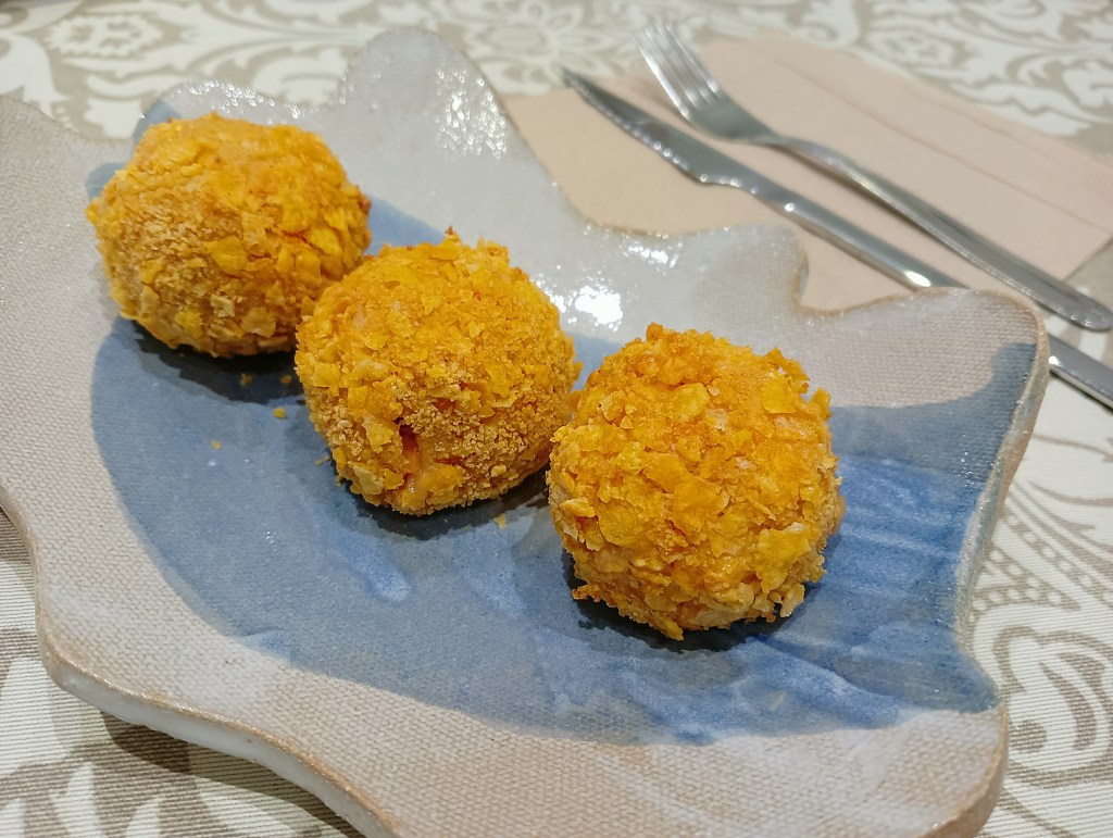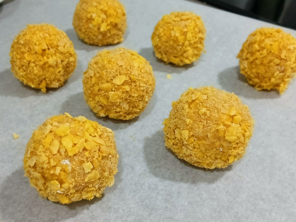 -cortamos trocitos de queso de cabra y colocamos en el centro de las bolas que hacemos