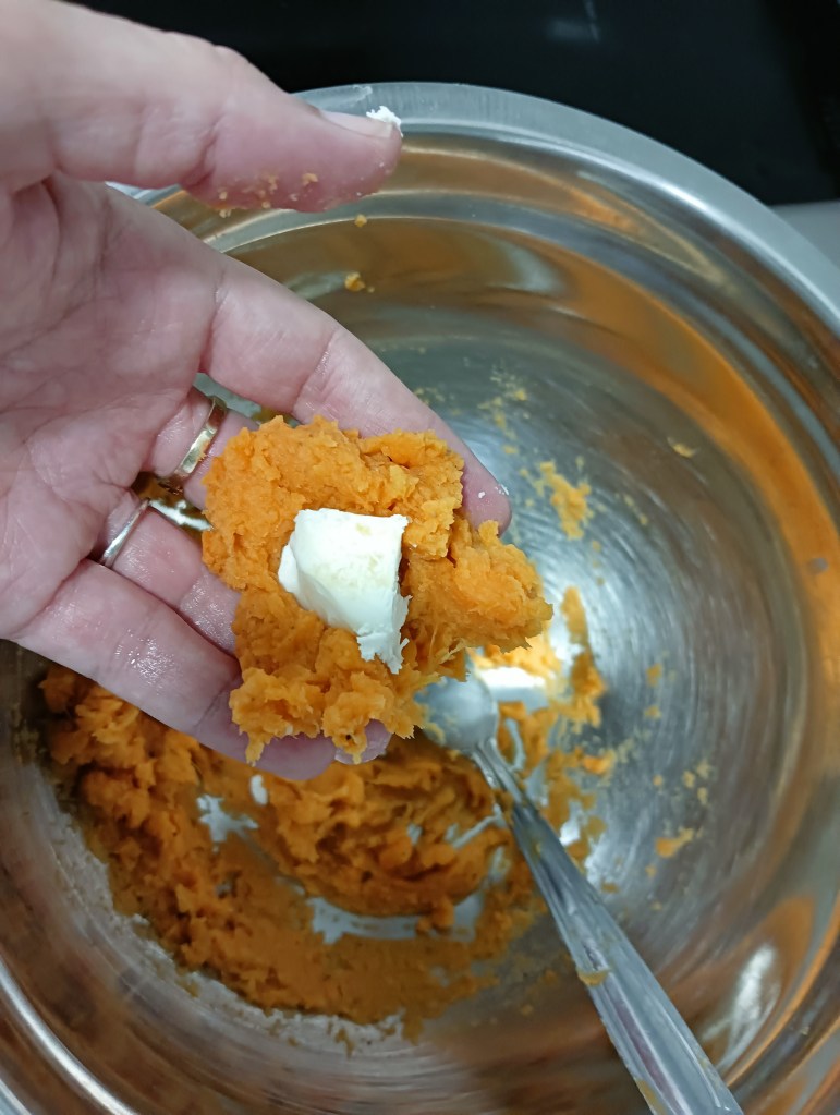 -cuando los boniatos estén cocidos, los pelamos y chafamos con un tenedor