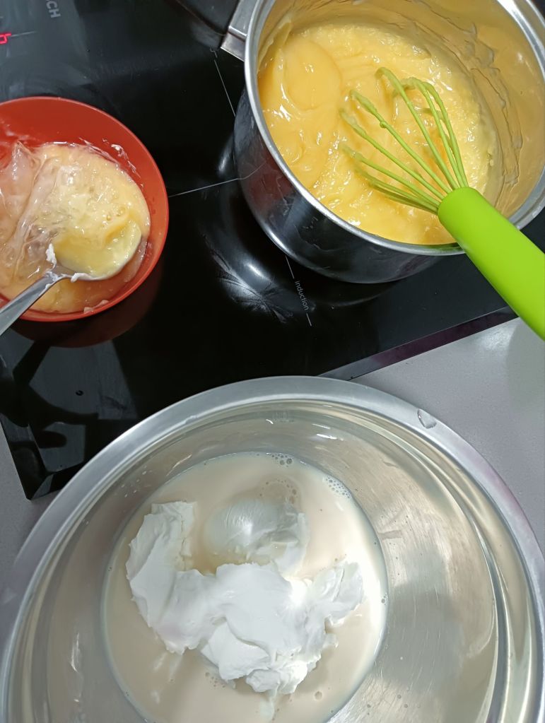 -ponemos a hidratar en agua muy fría las laminas de gelatina. Cuando estén bien hidratadas, las mezclamos con un poco de la crema de limón templada que hemos preparado y removemos bien hasta que se disuelvan. Luego, incorporamos con el resto de la crema