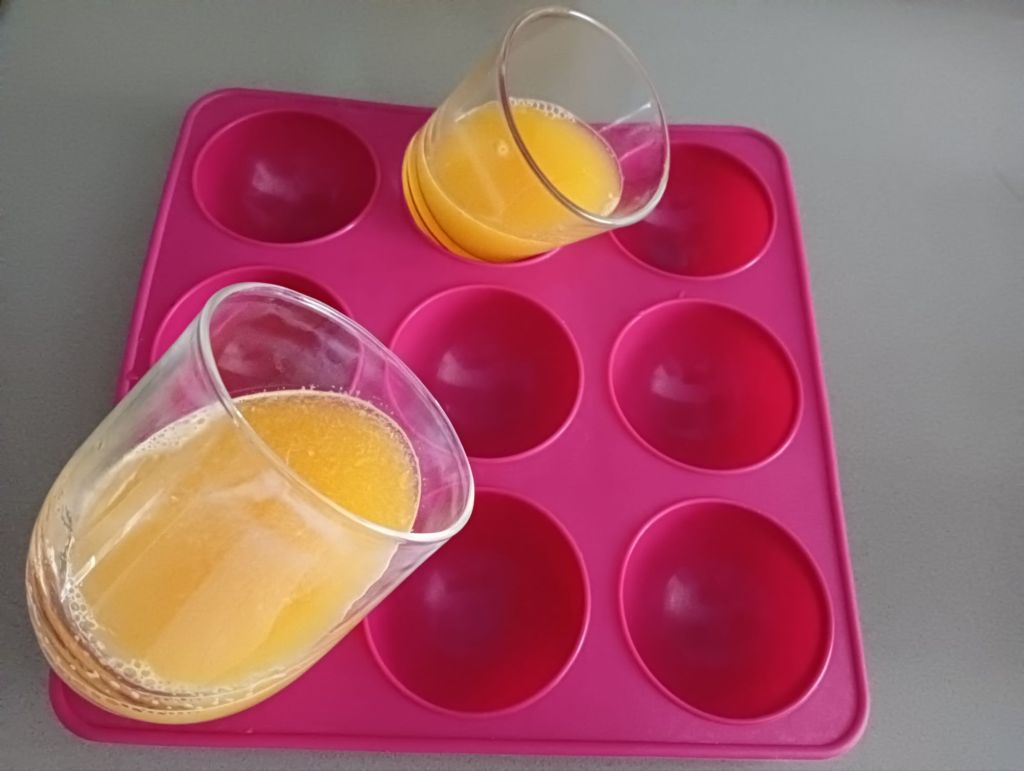 -vertemos la mitad en cada vaso (me he ayudado de un molde de semiesferas para poner los vasos inclinados hasta que el zumo se solidifique con la gelatina)