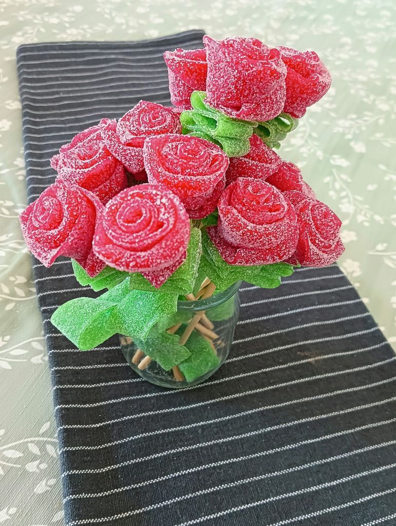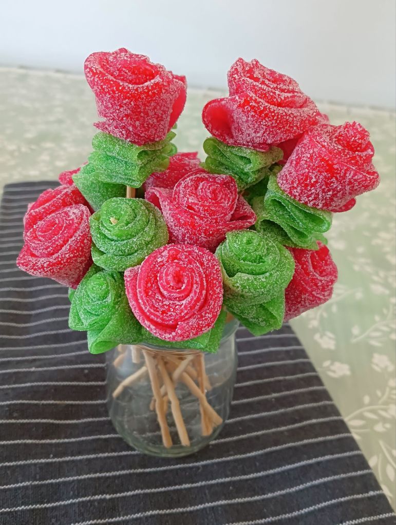 Quiero compartir estas rosas que he preparado este año. Quedan muy bonitas y si sois golosos como nosotros os gustarán seguro. Es muy fácil de preparar y tan solo requiere de lenguas de gominola rojas y verdes. Las verdes sirven para la base y simulan las hojas (yo he utilizado media tira para cada rosa) y las rojas para simular la rosa (una tira entera por rosa).