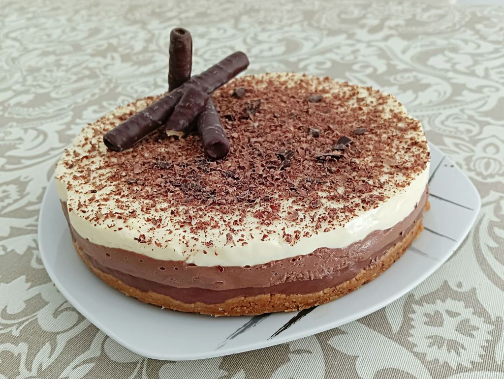 Hacía tiempo que tenía pendiente hacer esta tarta de tres chocolates, pero no encontraba la ocasión. He tardado en prepararla, pero la espera ha valido la pena, me ha encantado. La base está hecha de galletas y mantequilla (se puede preparar sin gluten) y luego tiene tres capas, una de chocolate negro, una de chocolate con leche y otra de chocolate blanco. El chocolate va mezclado con leche, nata y cuajada, que le aportan textura y cremosidad a la tarta. Si os gusta el chocolate os animo a prepararla en casa. No es nada difícil, lo único que se necesita es tiempo para que cuaje cada capa. Además no lleva azúcar, yo no le he añadido y os aseguro que está muy sabrosa. Espero que os guste tanto como a nosotros.