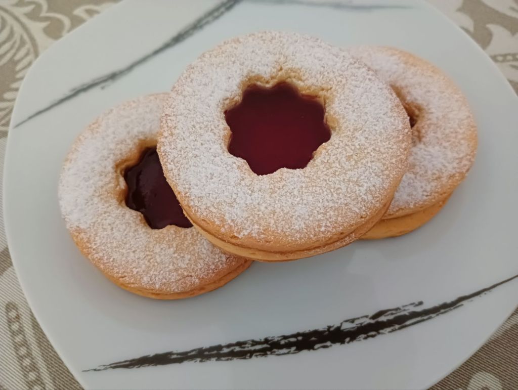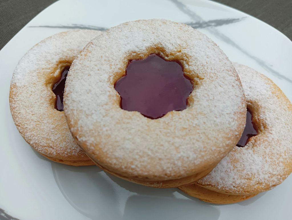 -a la hora de servir, espolvoreamos azúcar glas encima de las tapas y ponemos un poco de mermelada sobre las bases (no mucha, que luego al colocar la tapa se chafa y se esparce un poco)