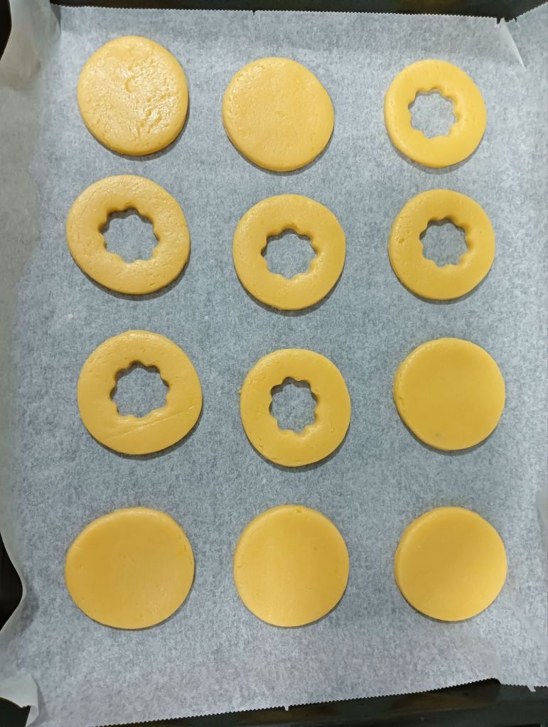 -cuando la masa ha reposado, la estiramos con un rodillo (las dejamos no muy finas) y con un cortador las vamos cortando. Intentamos hacerlas pares y a la mitad, que serán las tapas, les recortamos el centro con un cortador más pequeño
