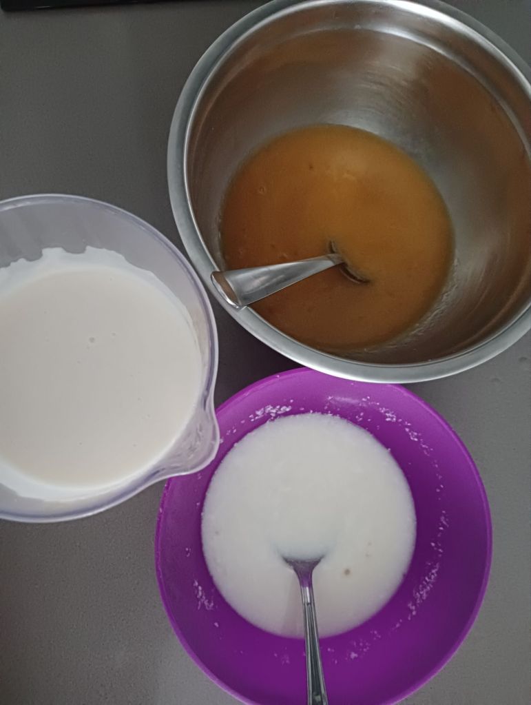 -por otro lado, batimos con unas varillas la leche evaporada para que tenga textura cremosa y añadimos a la preparación anterior con movimientos envolventes