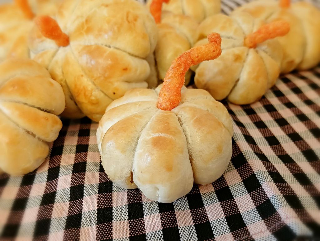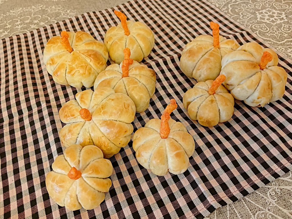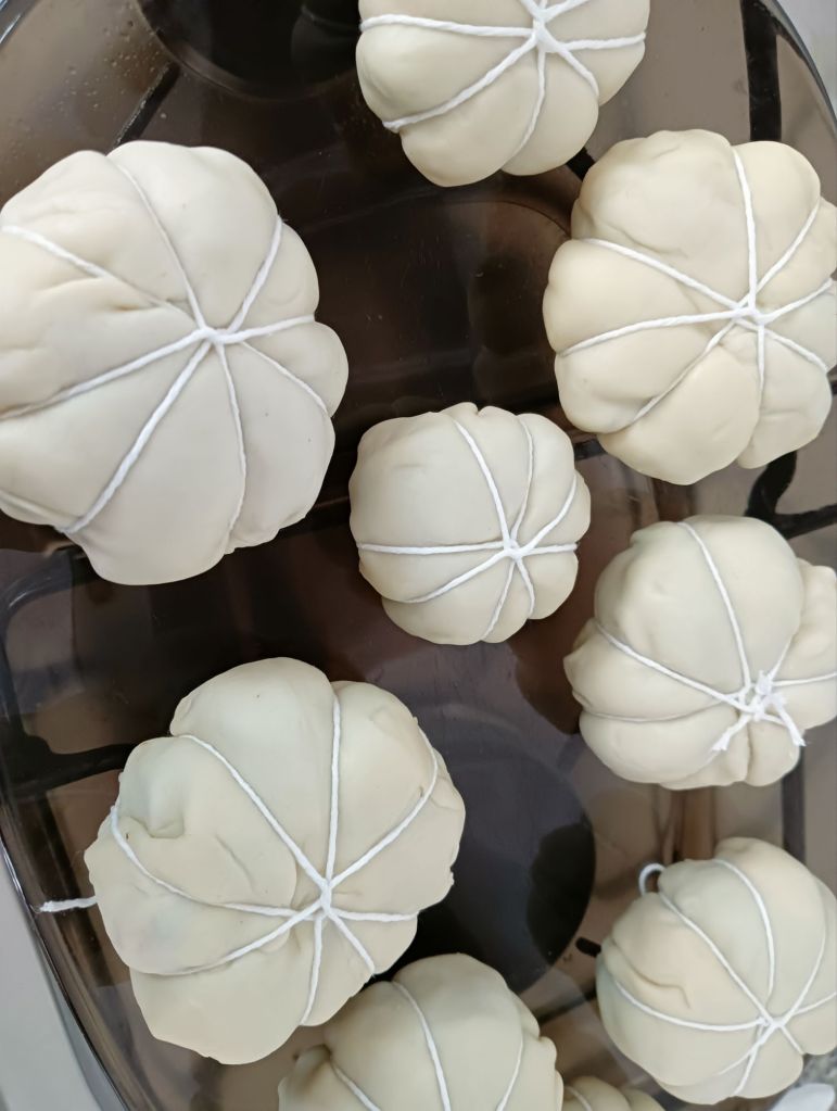 -dejamos enfriar y luego con mucho cuidado les quitamos las cuerdas sin que se rompa la masa. Decoramos por arriba con un palito o una patata para simular el rabo de la calabaza