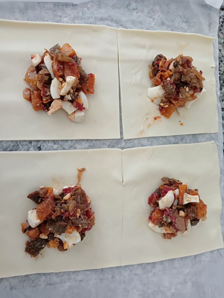 -cogemos una masa de empanada y la dividimos en porciones (podemos hacer cuadrados más grandes y otros más pequeños)