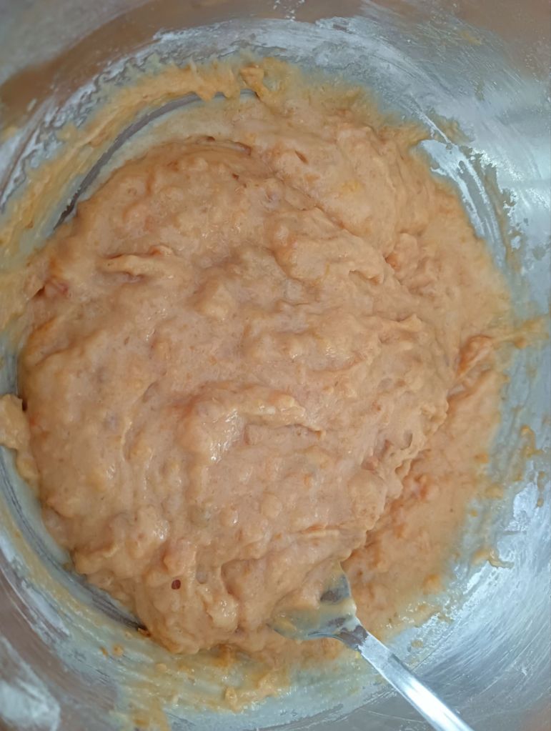 -batimos el huevo con el azúcar y luego incorporamos la leche. A continuación, añadimos la sal, la harina de fuerza y la levadura tamizadas y seguimos removiendo. Por último, incorporamos el boniato y mezclamos hasta obtener una masa homogénea