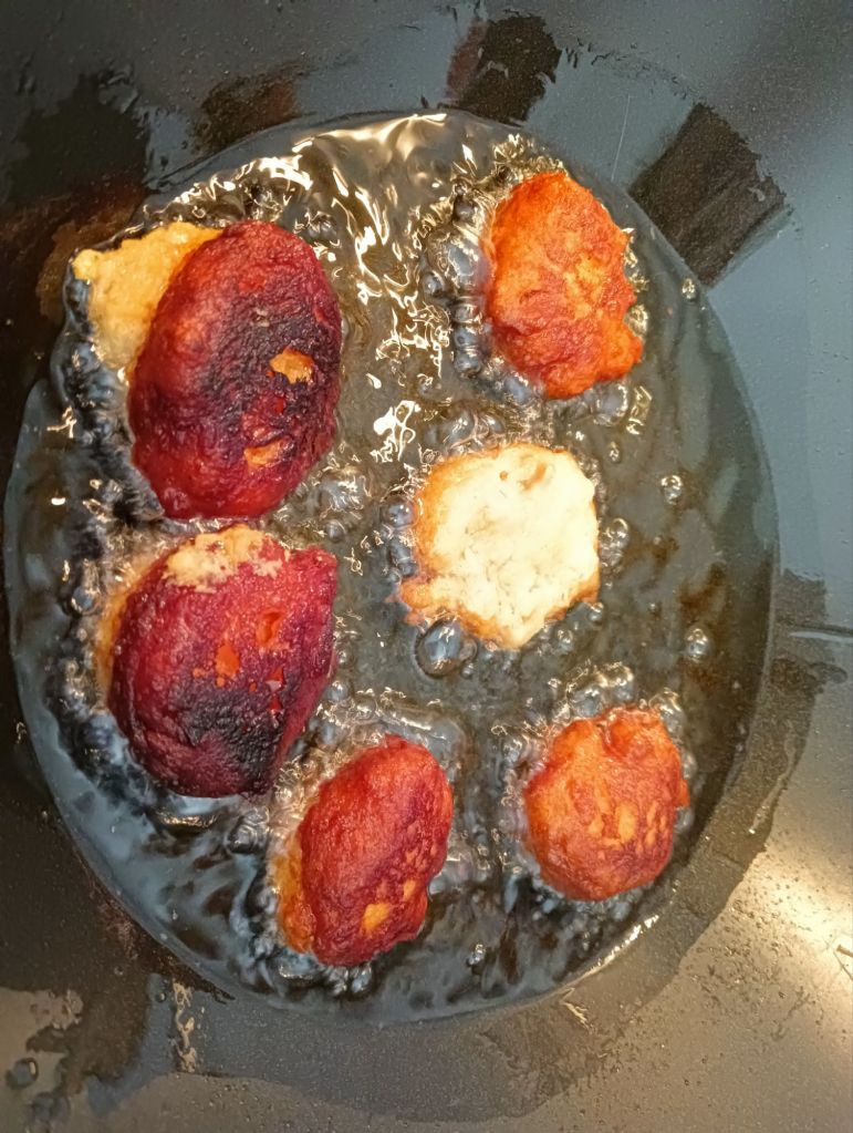 -ponemos en una olla o sartén abundante aceite y cuando esté bien caliente vamos vertiendo bolitas de masa, que hacemos con la ayuda de dos cucharas, ya que la masa es bastante pegajosa