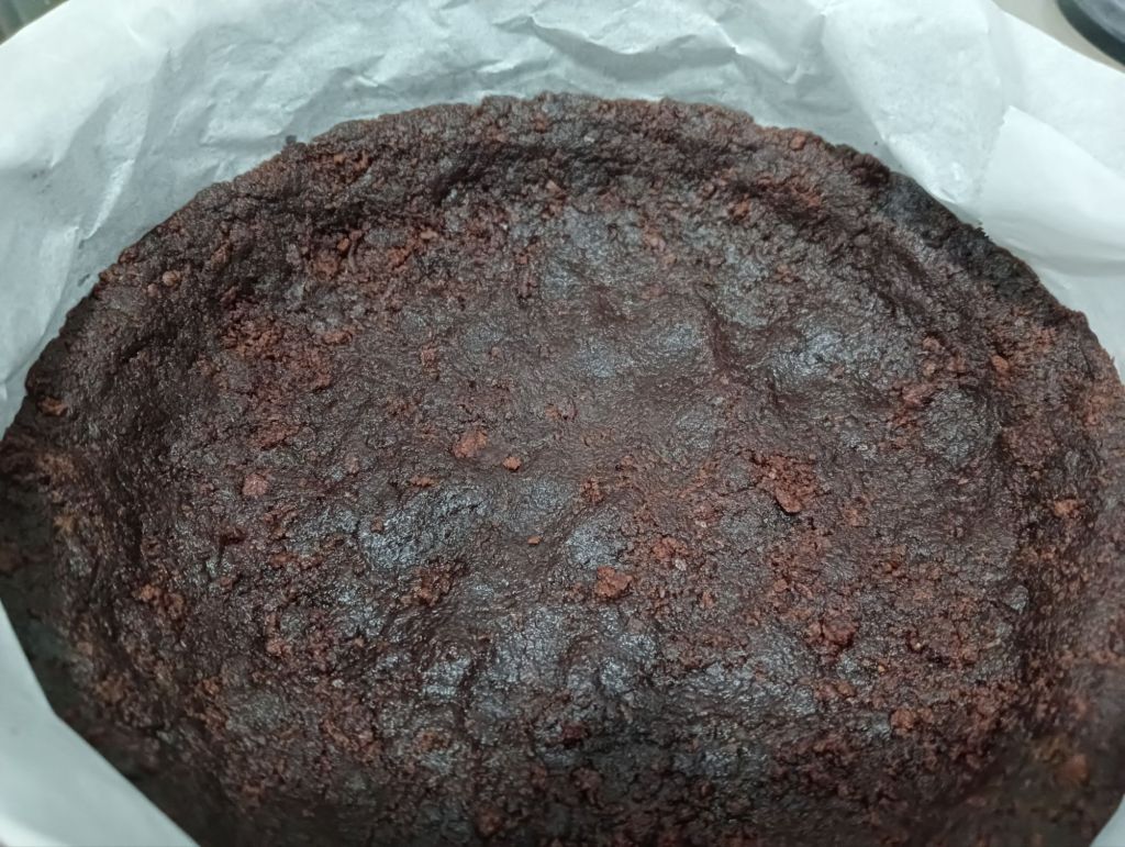 -forramos un molde redondo desmoldable con papel de horno y colocamos la base, que vamos levantando también por los bordes