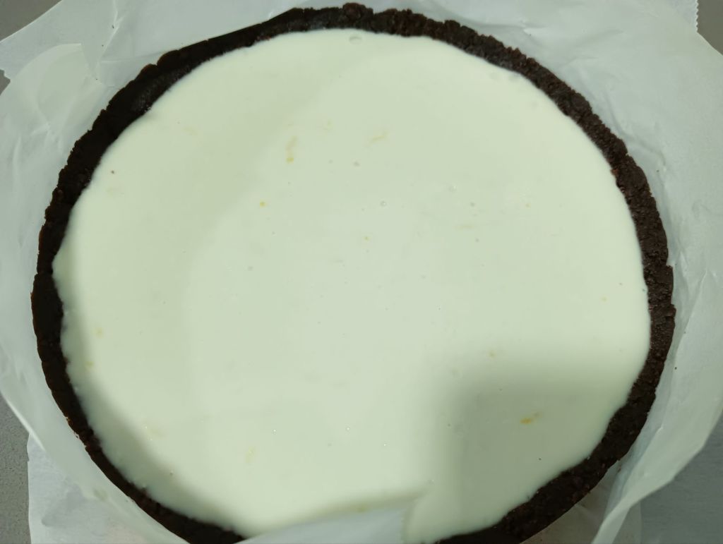 -dejamos templar un poco y luego vertemos dentro de la base con paredes que hemos preparado. Dejamos enfriar en la nevera