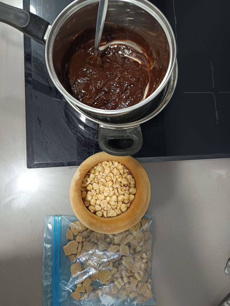 -añadimos las galletas y avellanas en la olla donde estamos fundiendo el chocolate y mezclamos bien para que se integren todos los ingredientes