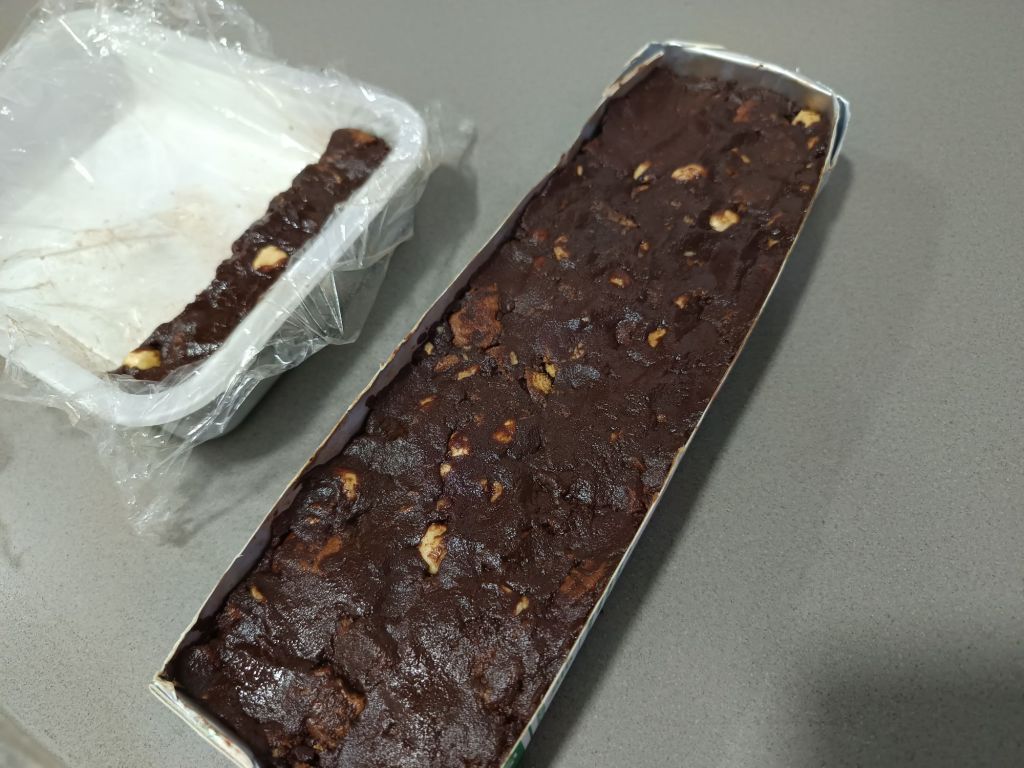 -vertemos la mezcla en el molde y chafamos bien con los dedos para que no queden huecos y esté bien compacto (a mí me sobró un poco de relleno y lo puse en otro recipiente de plástico con film transparente e hice una barrita de turrón)
