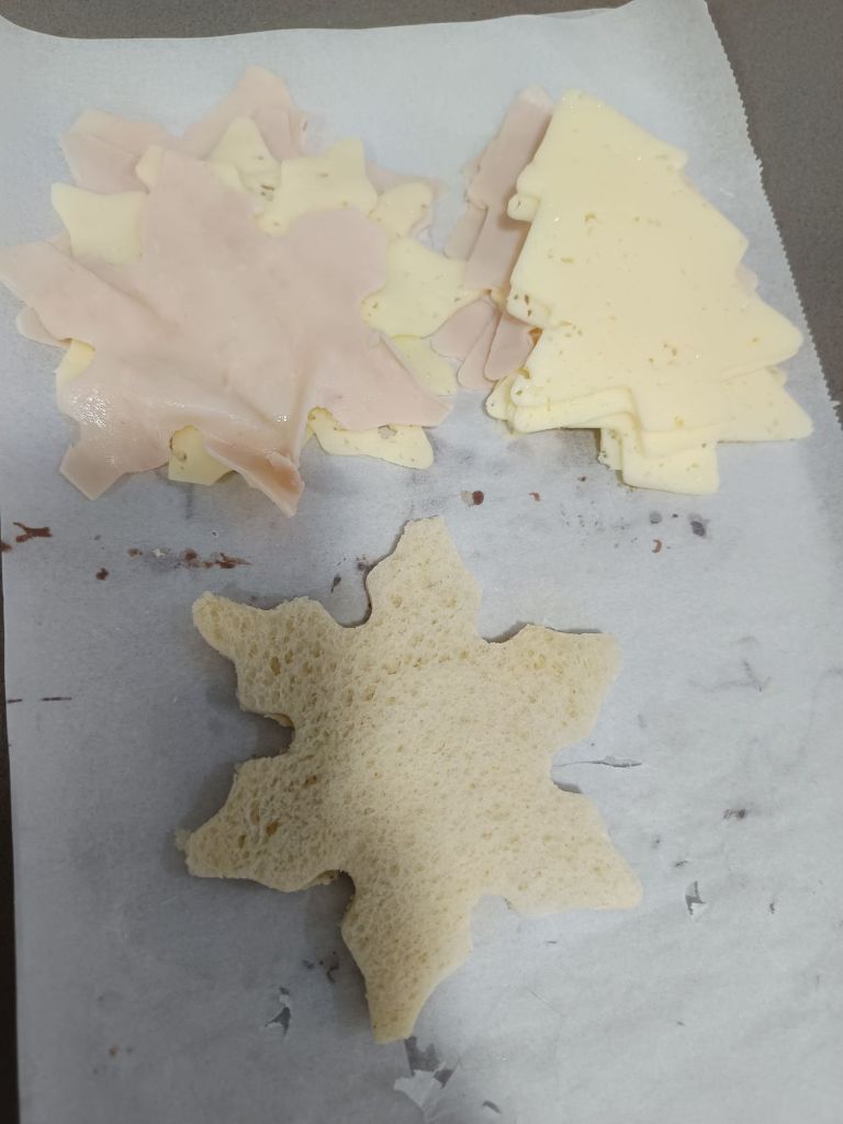 -utilizamos los cortadores que más nos gusten para cortar el pan de molde, el jamón dulce y el queso. Nosotras hemos hecho unos cuantos árboles y unas estrellas