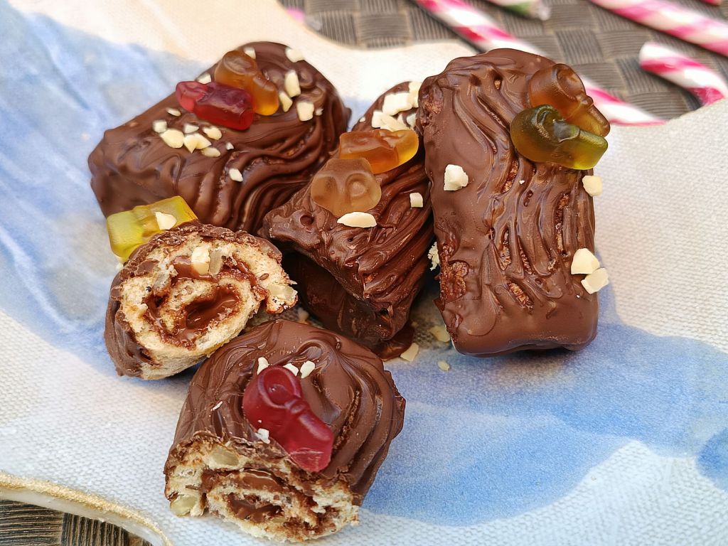 -fundimos el chocolate de cobertura y luego rebozamos los troncos