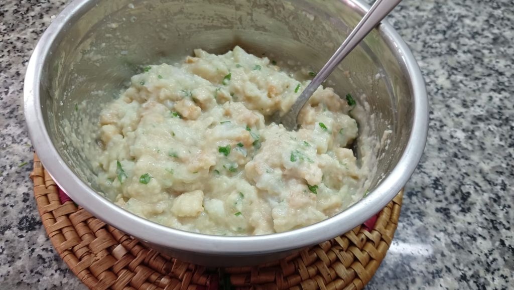 -troceamos pequeño el bacalao desmigado y mezclamos con el resto de ingredientes