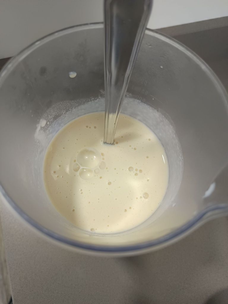 -empezamos batiendo los huevos y le añadimos el azúcar, el licor, la leche y una pizca de sal