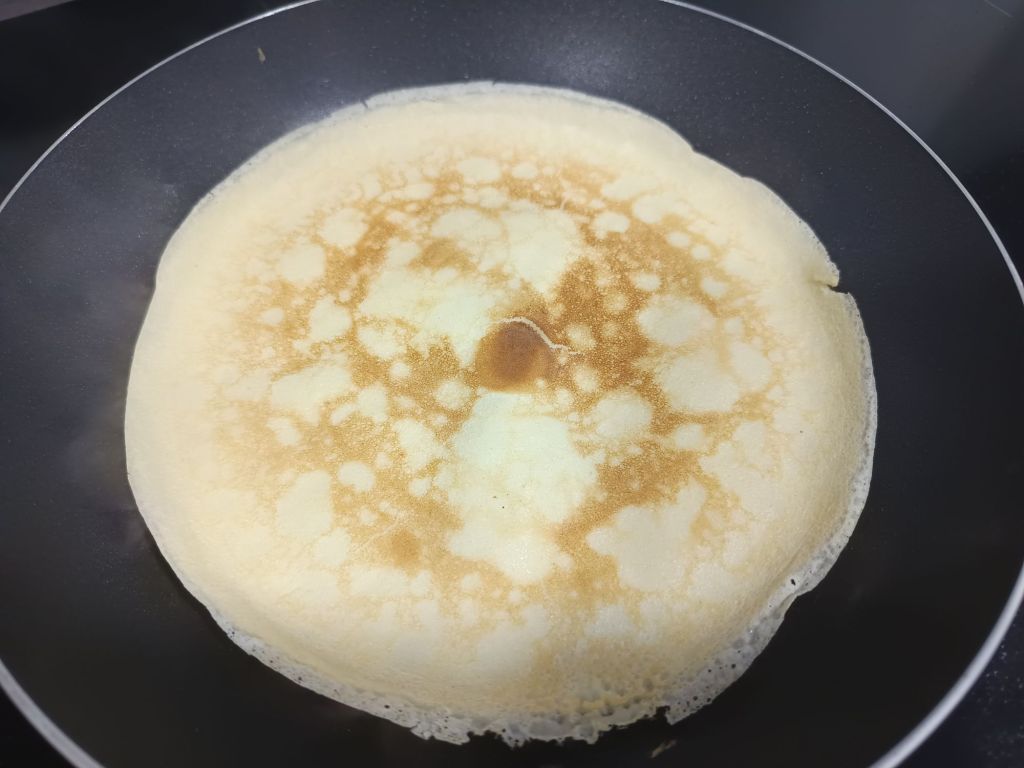 -untamos la sartén con un poco de mantequilla y añadimos un cucharón de masa (extendemos bien para que quede una capa fina). Le damos la vuelta para que se cocine por ambos lados y repetimos este proceso con toda la masa