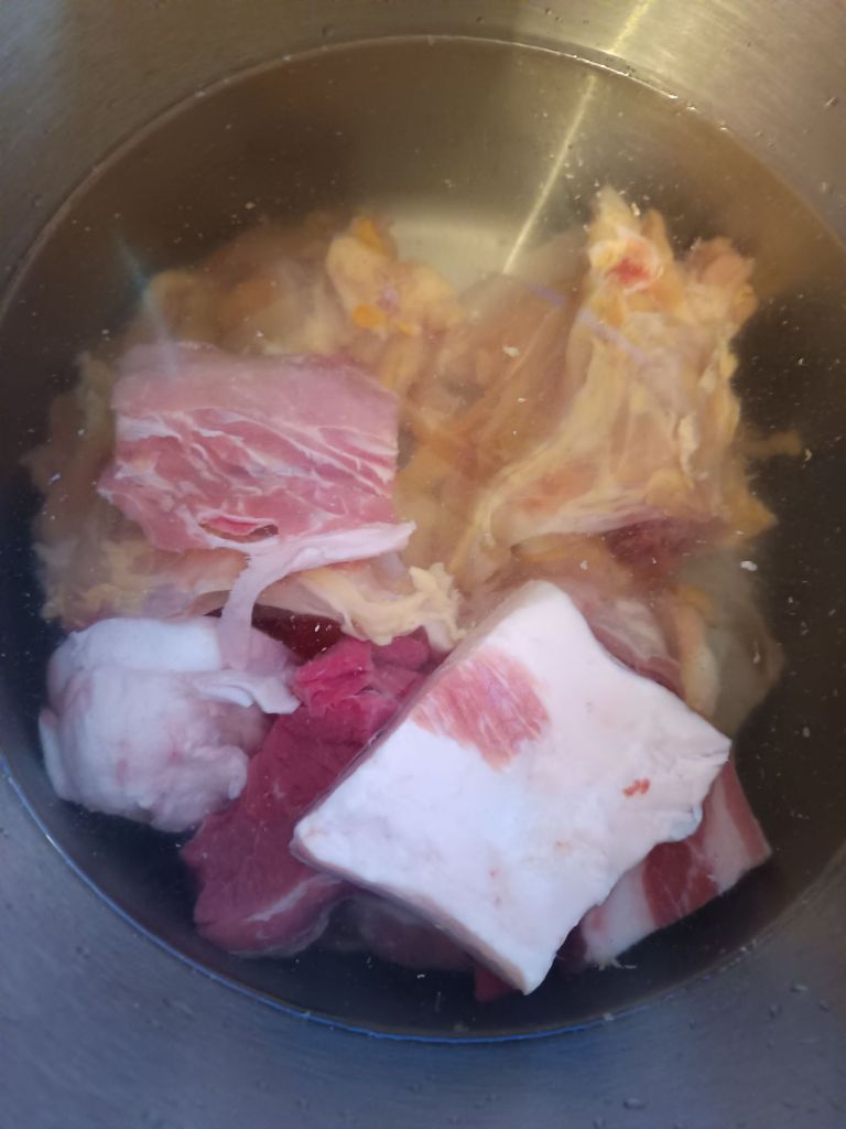 -una vez la carne esté limpia, la ponemos en una olla a cocer con agua junto con las verduras, con aproximadamente 5l de agua (con las cantidades de la receta)