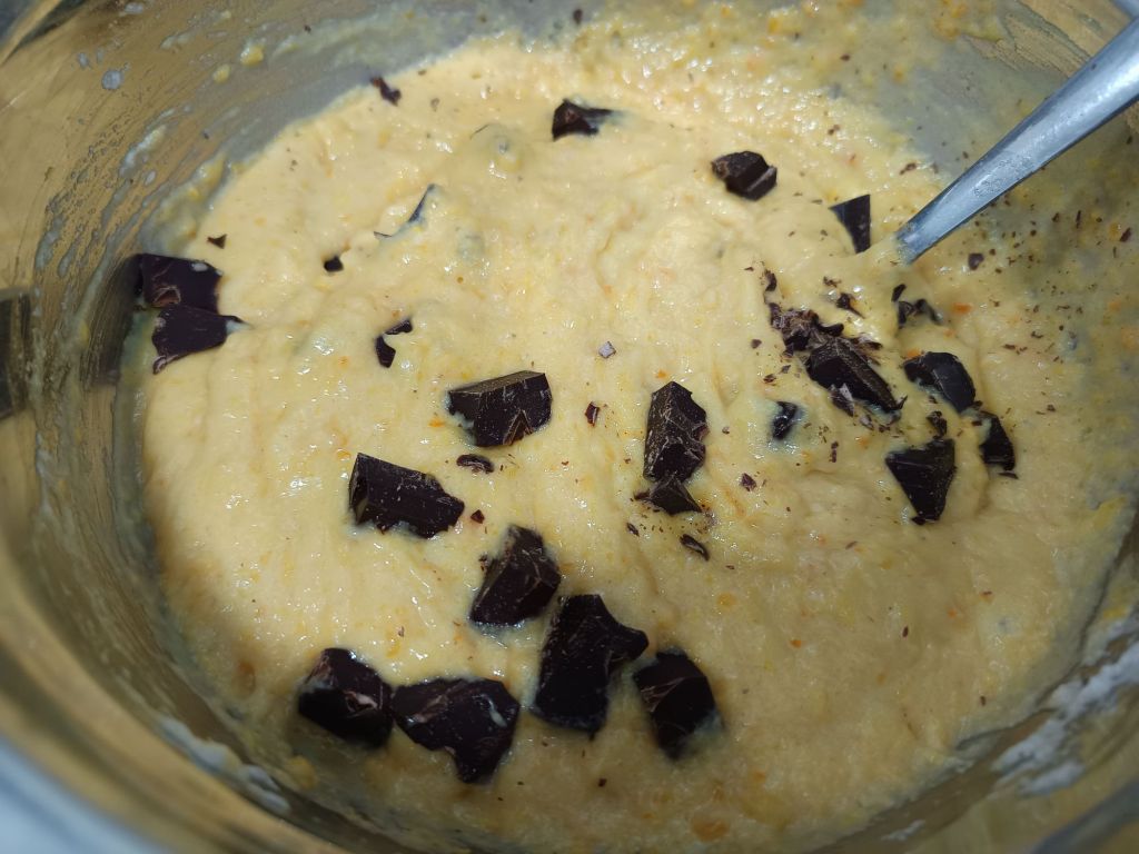 -por último, troceamos el chocolate de cobertura y lo mezclamos con la masa