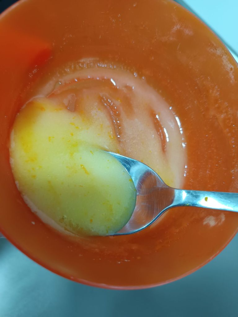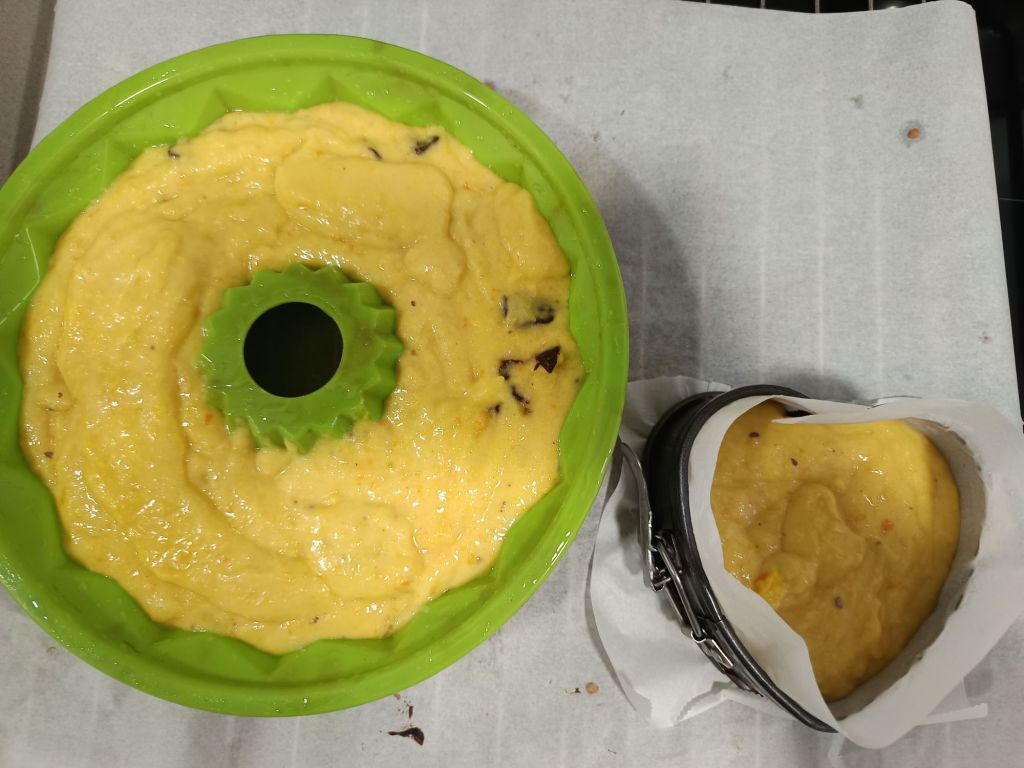 -añadimos las yemas, el aceite, una pizca de sal y el azúcar a la naranja triturada y luego incorporamos la harina y la levadura (tamizada) y mezclamos