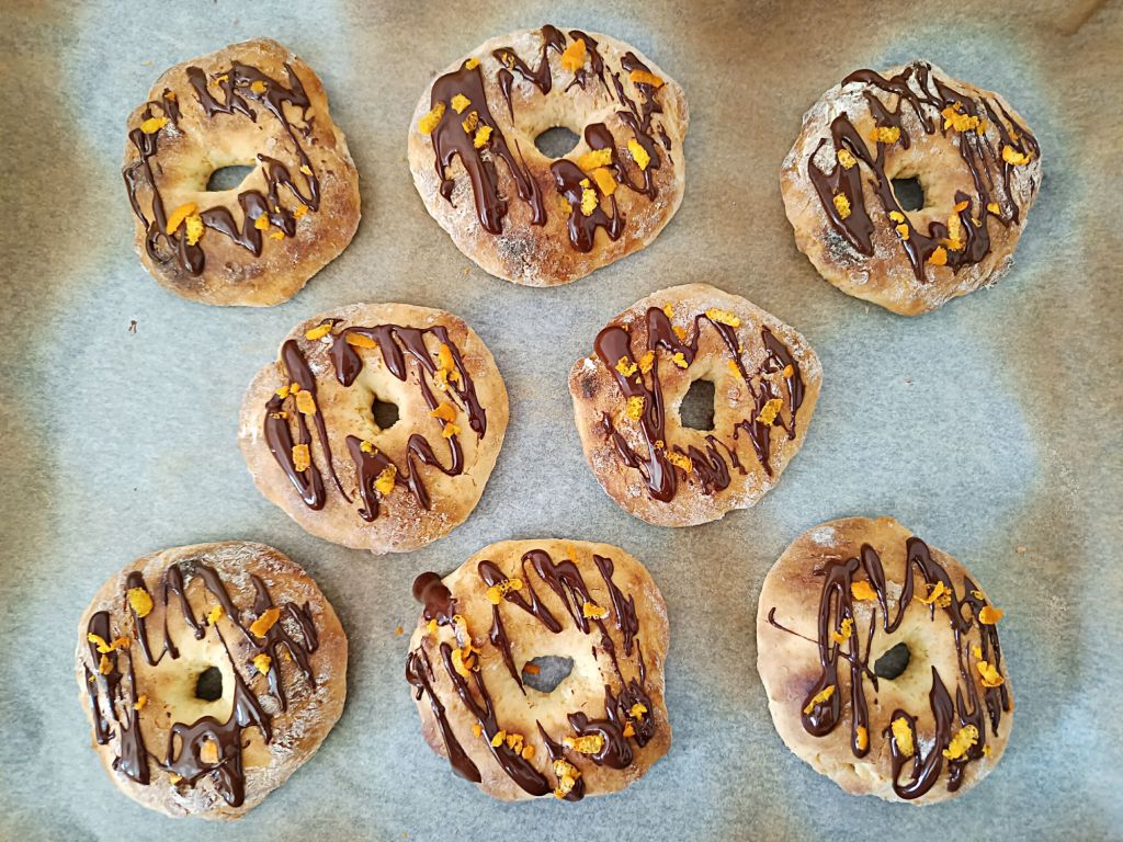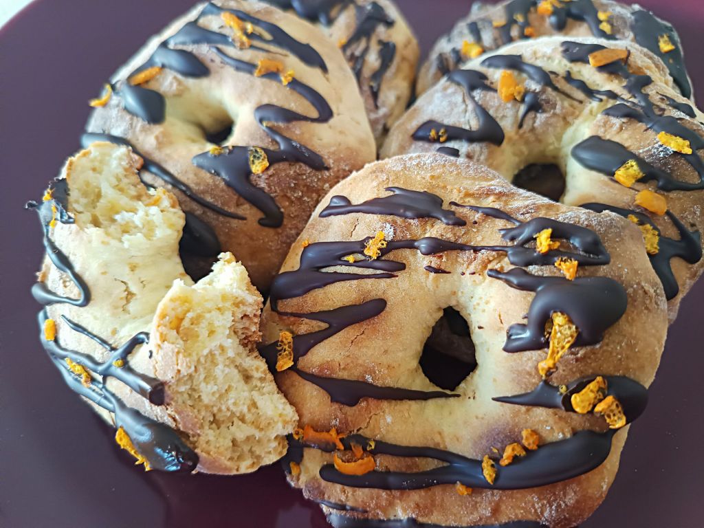 Aprovechando que tenemos naranjas de mis padres, el fin de semana preparé rosquillas de naranja al horno con un toque de chocolate, que han quedado buenísimas. Es una receta muy sencilla, que se prepara rápido. Con las cantidades que os doy me han salido 9 rosquillas.
