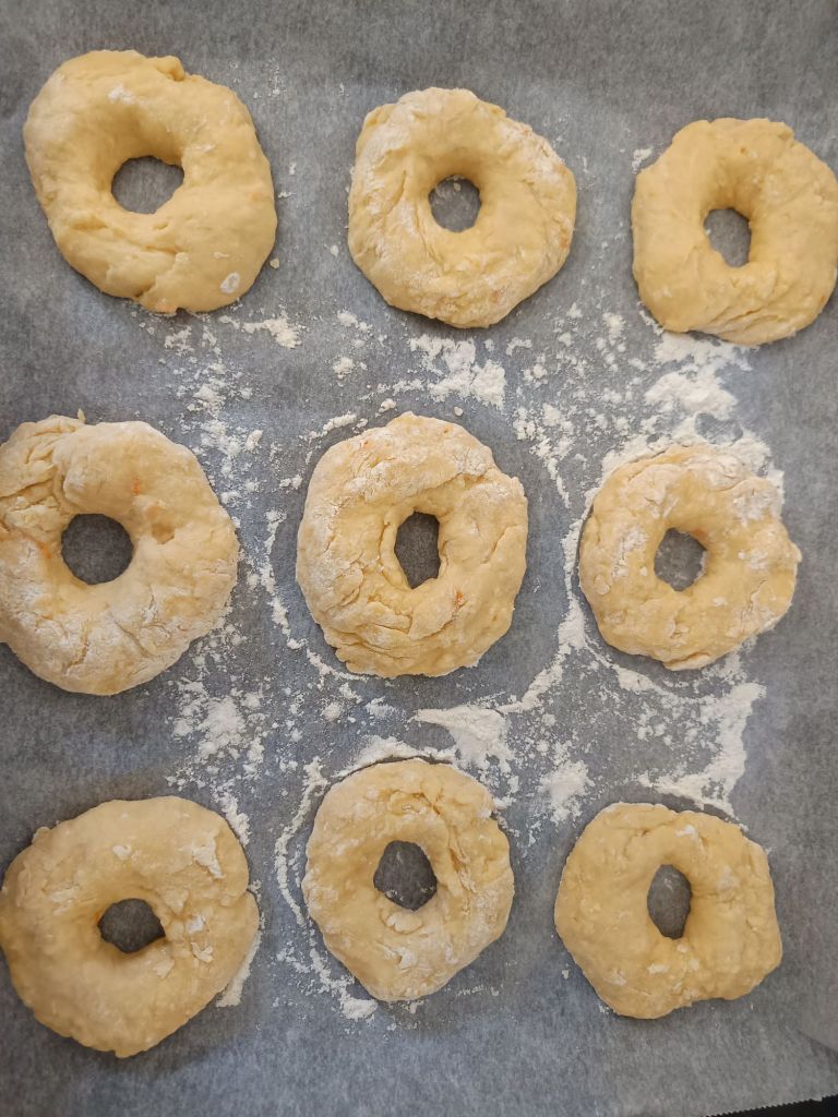-cuando la masa esté reposada, cogemos porciones y les damos forma de rosquilla (a mí me han salido 9)