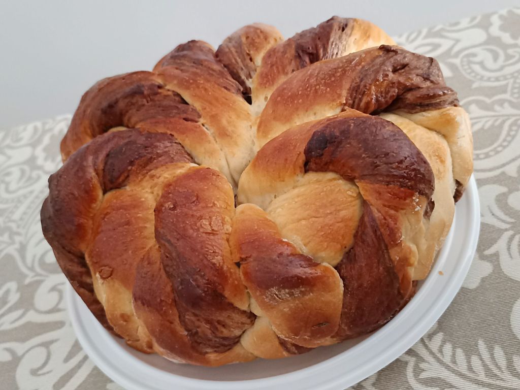 He hecho esta receta un par de veces, ya que cuando la vi por Internet me llamó mucho la atención y lo vi un postre original y muy vistoso. La primera vez, con las cantidades de la receta lo hice en un molde y se me desbordó, ya que la masa crece mucho y no me lo esperaba. Al hornear, como creció mucho, por la parte de abajo quedó un pelín poco hecho. Quise mejorar la receta y anotar bien las cantidades. Es un postre que requiere tiempo, ya que tiene que fermentar en varias ocasiones y la verdad que duplica su tamaño y al hornear crece más.