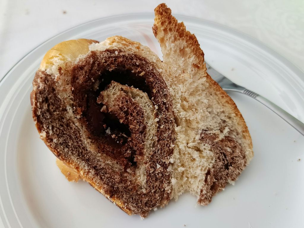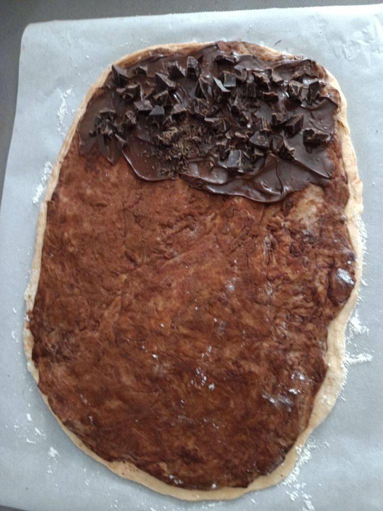 -untamos un extremo con Nutella o chocolate de cobertura fundido y le añadimos trocitos de chocolate por encima. Enrollamos por ese extremo hasta la mitad de la masa y la otra mitad hacemos tiras, que enrollamos sobre si mismas. A continuación, seguimos enrollando el rulo que teníamos y juntamos los extremos