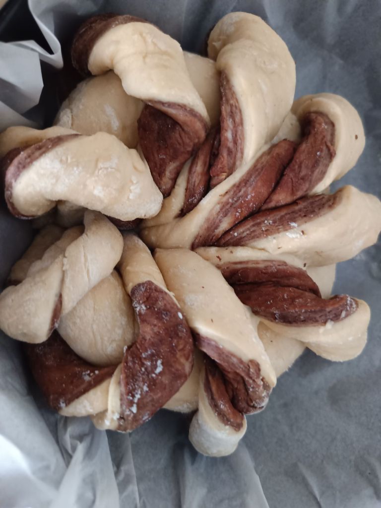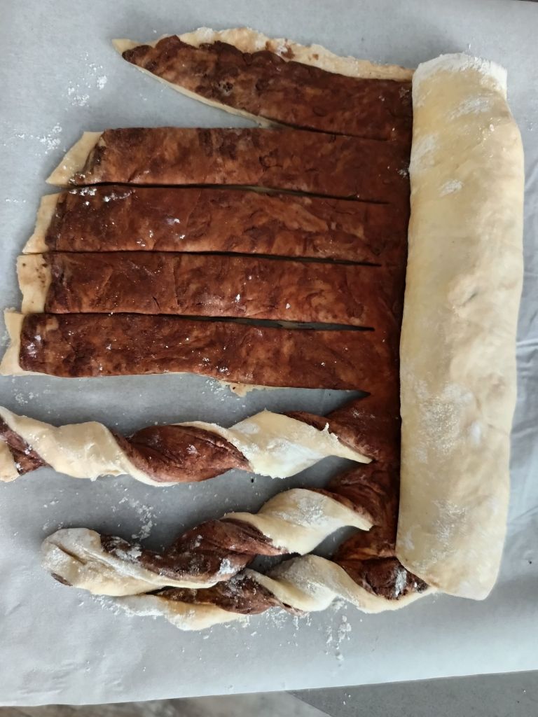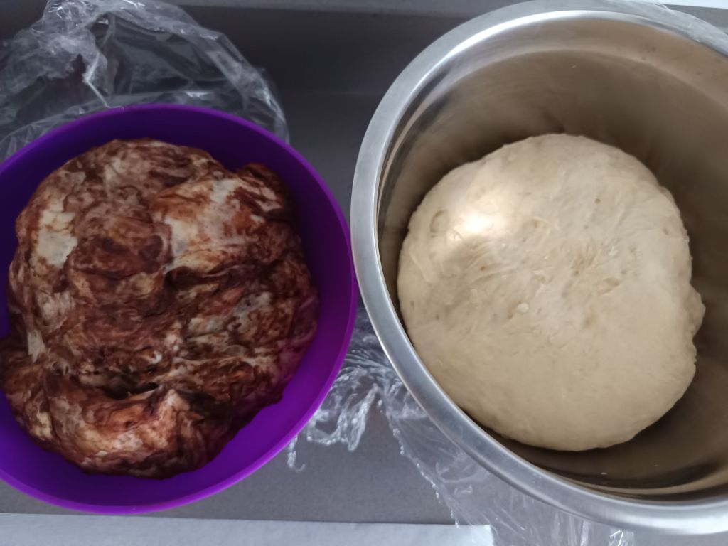 -separamos la masa en dos y a una mitad le añadimos el cacao y mezclamos bien con las manos para que se integre