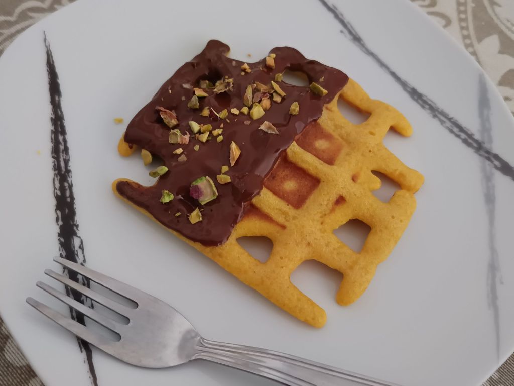Desde que Rafa me regaló la gofrera estoy experimentando para hacer gofres de distintos sabores y con diferentes toppings. Está vez los he preparado de calabaza y están buenísimos. Nos han encantado solos, sin el chocolate por encima, pero hemos hecho algunos decorados y la combinación es buenísima. Os animo a hacerlos en casa, es muy sencillo y el resultado vale la pena. Con las cantidades de esta receta salen 4 gofres (para dos personas).