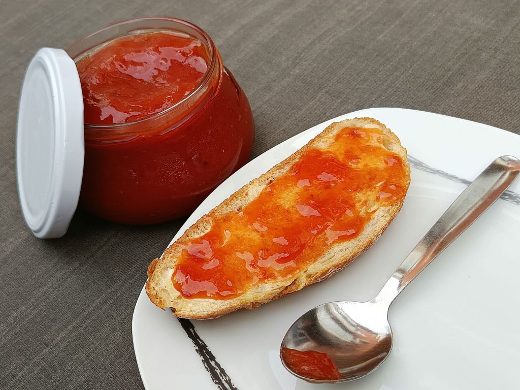 -retiramos del fuego y dejamos enfriar fuera de la nevera. Trituramos y luego, la envasamos en botes de cristal y dejamos en la nevera