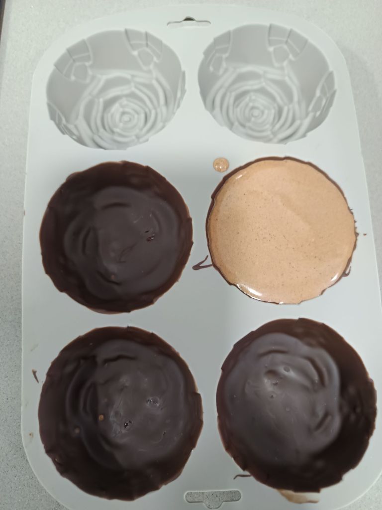 -empezamos preparando la cobertura. Para ellos, fundimos en el microondas el chocolate de cobertura y lo vertemos en nuestros moldes. Lo extendemos bien y dejamos una capa fina y uniforme. Dejamos enfriar en la nevera