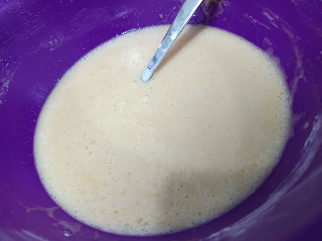 -mezclamos con unas varillas en un bol los huevos junto el azúcar y la ralladura de limón