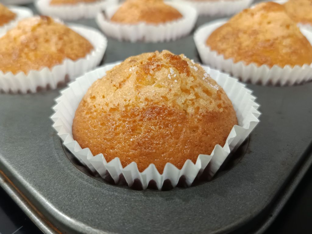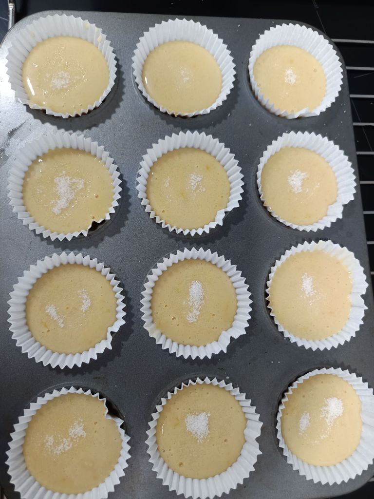 -una vez reposada y fría, rellenamos los moldes de nuestras magdalenas (lo hacemos por la mitad, ya que luego crecen en el horno)
