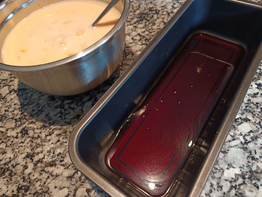 -vertemos el caramelo en el fondo del molde y a continuación, con cuidado, la mezcla del flan