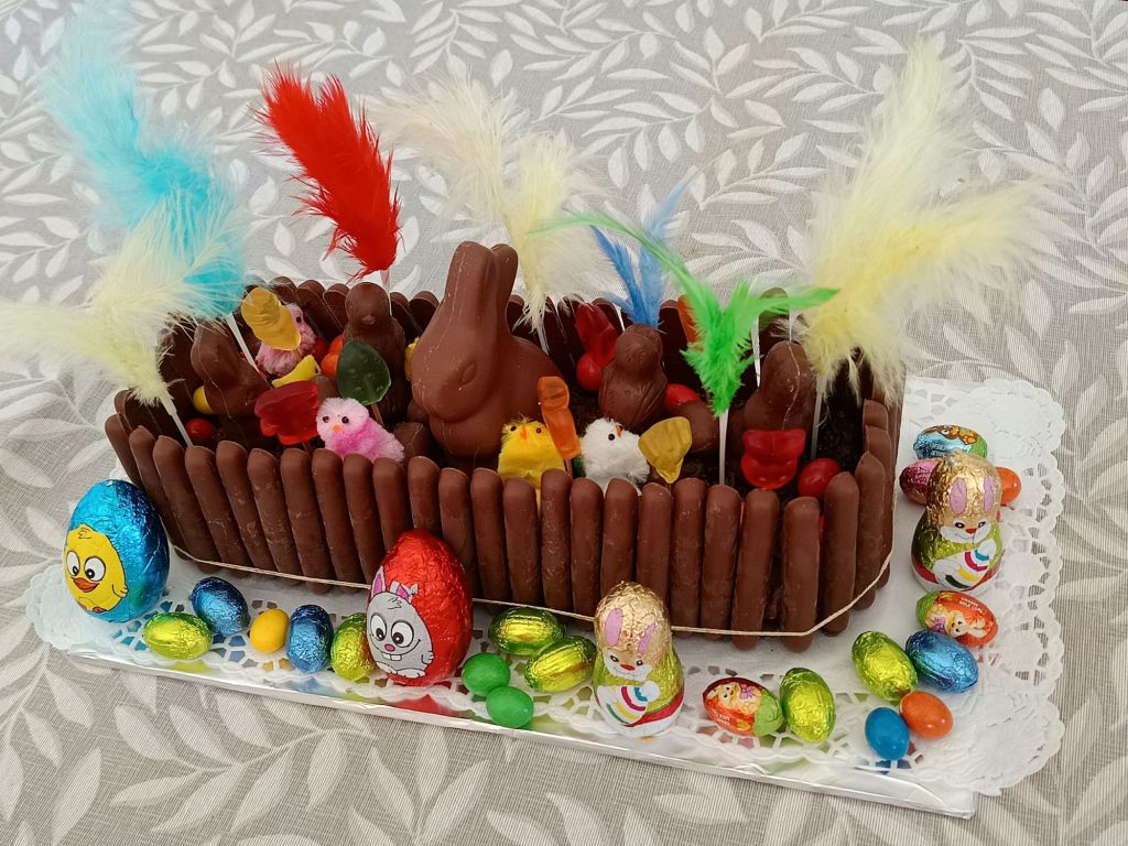 -para decorarla: chocolate de cobertura, palitos de chocolate, cereales Korn Flakes, huevos y figuras de chocolate, gominolas, Lacasitos, pollitos y plumas
